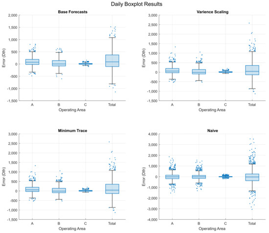 Daily box plot results for the error distribution across different operating areas, comparing each reconciliation method (variance scaling, minimum trace, and naïve).