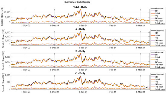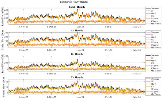 Observing Figure 10 and Figure 11, the actuals are shown in black, BF in purple, MinT in orange, and VS in yellow. The corresponding dashed lines in the same colors indicate the differences between each method and the observed gas demand. Gas practitioners are particularly interested in accurate forecasts during peak winter periods [23,34,35]. In Figure 10, the orange peaks stand out, indicating that MinT reconciliation effectively leverages the correlation between exogenous weather variables and gas consumption in areas , , , and . This is, in part, due to the MinT method’s ability to model inter-hierarchy series interaction (via the inclusion of off-diagonals of ). The VS method performs similarly, but does not consider these interactions and does not perform as well on these peaks. Figure 11 shows daily estimates with a similar pattern of orange peaks, though not as consistently. This suggests that the smoother, lower-frequency daily series benefited from MinT reconciliation, but not as significantly as the hourly results in Figure 10. This also motivates further research into gas demand reconciliation and suggests that training specialized forecasting models for each hierarchical level could better leverage different exogenous correlations.