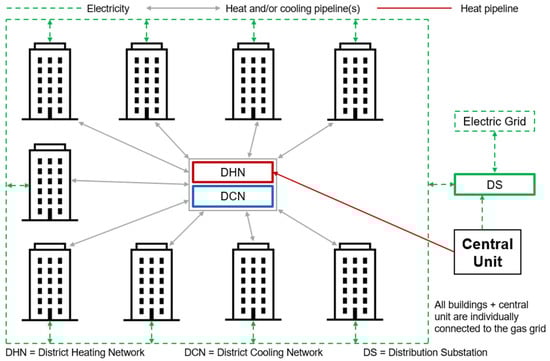 The EC superstructure is depicted in Figure 1. As observed, this representation is intended to illustrate all possible connections between the buildings in terms of heating, cooling, and electricity. When it comes to heating and cooling, the buildings can connect to each other through the district heating network (DHN) and the district cooling network (DCN). The central unit is also connected to the EC through a heating pipeline (there is no cooling produced in the central unit). An observation should be made at this point that a given building cannot possibly connect to all the other buildings, due to physical distance constraints.