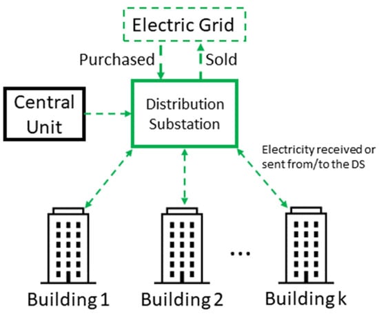 The DS electricity balance management is one of the main details of the EC superstructure. Figure 2 illustrates the main idea behind the DS balance management. As mentioned before, the buildings are not directly connected to the national electric grid. Instead, they are connected to the DS. Such connection is set to function in both directions (not at the same time), i.e., depending on the obtained solution, a given building will be: (i) sending electricity to the DS at some hours of the year (self-production surplus), (ii) receiving electricity from the DS at some other hours of the year (self-production deficit), or (iii) neither receiving nor sending electricity from/to the DS at some other hours of the year (self-production is equal to the electricity demand at these hours). The central unit does not have an electricity demand. For this reason, all produced electricity would be sent to the DS. Then, in agreement with the objective function of the EC model, the DS will (i) purchase (or not) the necessary amount of electricity from the national electric grid, or (ii) sell (or not) the total surplus of self-produced electricity by the entire EC, after having satisfied the electricity demand of each building. Figure 3 provides the actual location of each EC building and the possible DHCN connections.