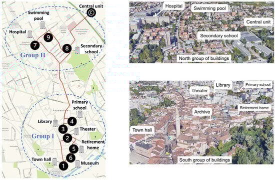 (Left): DHCN superstructure for nine buildings plus central unit located in Pordenone, Italy. (Right): Actual locations of the buildings.