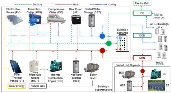 All the other EC buildings, depicted in Figure 4, have the same superstructure of building k, i.e., available energy resource types, technologies, and DS, DHN, and DCN connections.