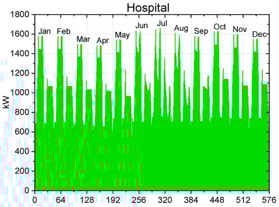 Figure 5 shows the hourly electricity demand for the hospital and for each typical day (the reader may find the electricity demand for all the other buildings in the Supplementary Material, Section S1). The horizontal axis represents two 24 h typical days per month. As observed, electricity is demanded throughout the whole year, for the majority of the buildings. For some buildings such as the library, schools, and swimming pool, the electricity demand follows the occupancy levels, i.e., it is higher during the school year (from September to June). The theater and hospital have an approximately constant electricity demand throughout the year since their occupancy level does not depend on vacation or non-vacation periods. The town hall, retirement home, and museum are buildings that should operate during the entire year. For this reason, they also have electricity demand throughout the entire year, but with lower levels during the period of daylight-saving time.