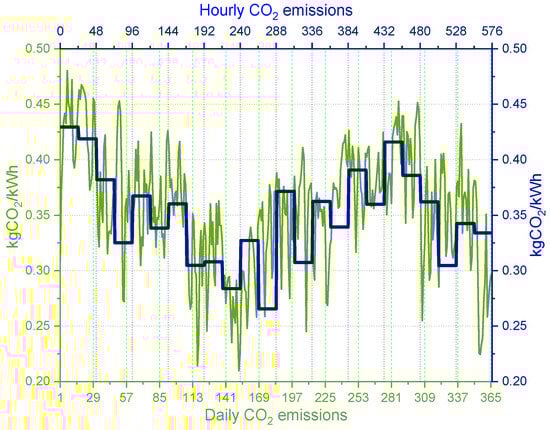 The total EC heat balance is shown in Figure A2. As seen, the winter period is characterized by a substantial contribution of ICE and HP (Figure A2A). Also, the heat received from the central unit—which is exclusively produced by solar thermal panels (STc) and supported by hot water storage (HSTc) (Figure A2B)—plays an important role to cover the total EC heat demand. The boiler only comes into play when the mentioned technologies are at full load and there is still a missing portion of the heat demand to be covered, as observed in hours 7 and 8 of Figure A2A.