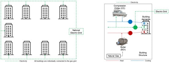 In the initial synthesis stage, defining the energy supply system’s superstructure is fundamental. This superstructure comprises possible technologies and their interconnections, personalized to meet the due energy demand. Then, after the optimization process, the superstructure is updated to an optimal form containing the layout of the optimized energy supply system consisting of the pieces of installed equipment (model, size, and number of pieces) as well as their interconnections. Accordingly, specific conditions should be defined in order to express the boundaries of the case study analyzed in this work. Such conditions comprise not only the energy demand profiles of each building, but also the locally available energy resources. With such pieces of information, the technologies can be selected according to optimal interactions between them. This will determine the proper fulfillment of the energy demands.