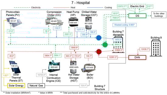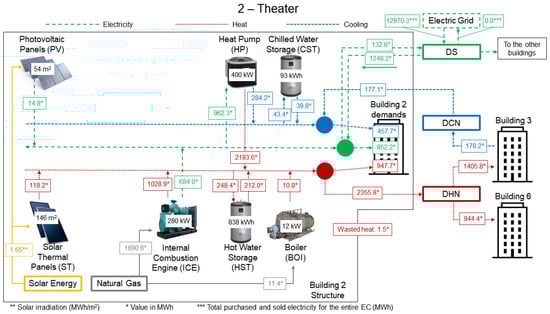 As already mentioned, the distribution substation, district heating network, and district cooling network provide all EC buildings with the opportunity to share the three demanded utilities, namely electricity, heat, and cooling. In this way, the EC model is allowed to search for favorable solutions by producing the needed utility where its production will be more advantageous for the EC, according to the objective function.