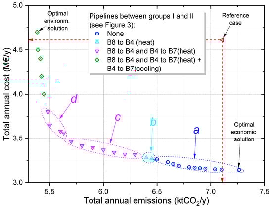Table 18 presents the results derived from successively solving the EC model for different ε values. The process started with the optimal economic solution and went all the way to the other end of the Pareto front, i.e., the optimal environmental solution. In this case, the ε values were consecutively lower total annual CO2 emissions and the consequence was the Pareto front depicted in Figure 12 with 29 solutions and different energy supply system structures as well as installed capacities. As indicated in the same figure, there are four sets of solutions (a, b, c, and d) which will be explained in the following paragraph.