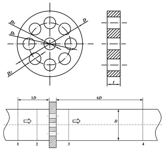 Figure 1 illustrates the structural parameters of a typical perforated plate and its arrangement in the measurement pipeline, with the perforated plate aligned with the center of the circular pipe. The structural parameters include the diameter of the central circular hole D1, the diameter of the circular hole D2, which uniformly distributes in the circumferential direction, the diameter of the circular hole D2 orbit Dr, the diameter of the orifice plate and the pipeline D, and the thickness of the orifice plate t.
