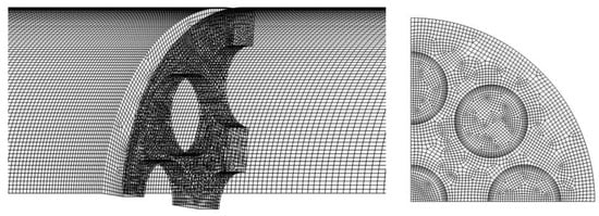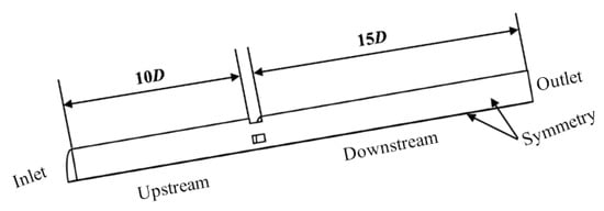 Due to the symmetry of the perforated plate structure, to reduce the number of grids for CFD simulation and improve computational efficiency, the flow field and perforated plate in Figure 1 are simplified to a quarter of the total during the geometric modeling, taking a 90° angle range, as shown in Figure 2. To ensure the full development of upstream flow and the complete recovery of downstream static pressure in the perforated plate, the lengths of the upstream and downstream flow fields of the plate are set to 10D and 15D, respectively, where D = 50 mm.