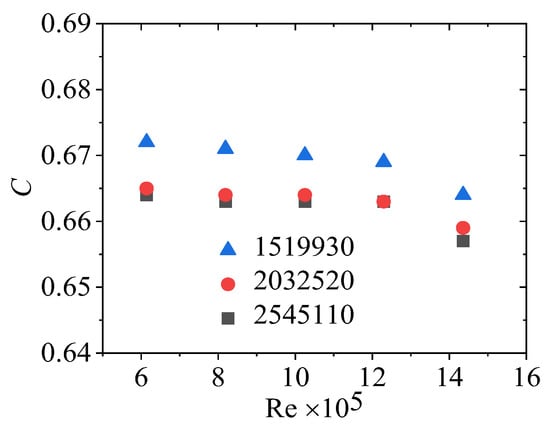 Grid independence verification was performed for different grid numbers, namely, 1,519,930, 2,032,520, and 2,545,110, respectively. Using LN2 as the working medium, simulations were conducted for flow coefficients (C) corresponding to inlet velocities of 2.4 m/s, 3.2 m/s, 4.0 m/s, 4.8 m/s, and 5.6 m/s, as defined in Equation (8), as shown in Figure 4. It was observed that the results for mesh numbers 2,032,520 and 2,545,110 were very close, with a variation in C of less than 0.3%. Therefore, the calculation continues using the mesh partition scheme with 2,032,520 meshes.