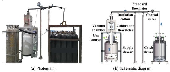 The photograph and schematic diagram of the developed LN2 flowrate test setup are illustrated in Figure 5. LN2 is pressurized out of a 300 L Dewar by high-pressure gas, flows vertically through the tested flowmeter, sequentially enters the Hoffer standard orifice flowmeter and cryogenic control valve, and finally enters the open receiving Dewar. The vertical sections of the LN2 pipeline are vacuum insulated, ensuring that the flow through the flowmeter is full of single-phase LN2.