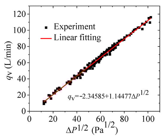The pressure difference ΔP during the experiment is measured by a Rosemount 3051 transmitter, with an accuracy of ±0.075%. The flow rate is measured by a Hoffer-HFC2000 balanced flowmeter, with an accuracy of ±0.2% FS and a range of 0~10 m3. The experimentally measured LN2 flow rate qv shows a linear relationship with , as shown in Figure 7.