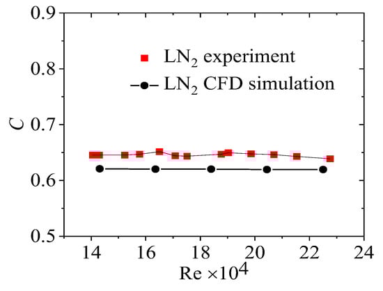 Figure 8 compares the flow coefficient C and pressure loss coefficient ζ calculated numerically with experimental values. According to the error propagation formula, we finally determined that the maximum propagation error of C from the experiment is 0.2%. It was found that the trends of both parameters varying with Re are consistent, but quantitatively, the experimental values are larger than the calculated values, with an error of less than 5%. This deviation may be attributed to the difficulty in completely matching the actual conditions in the measurement with the numerical simulation. Overall, the experimental results validate the accuracy of the constructed CFD model for a perforated plate with LN2 flow.