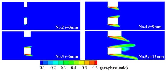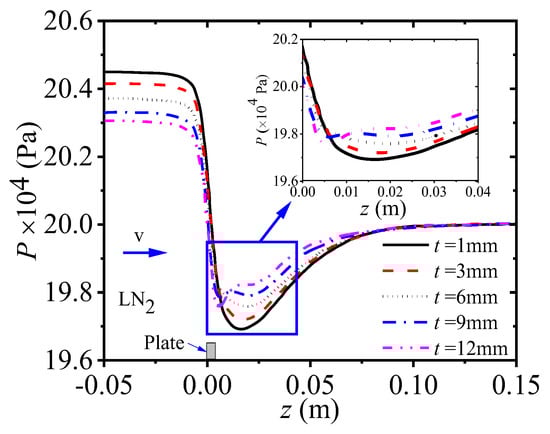 Based on the optimal two-dimensional structure of the perforated plate obtained from the above orthogonal experiments, further numerical analysis was conducted to investigate the influence of its thickness. Five thickness levels were considered: t = 1, 3, 6, 9, and 12 mm, with LN2 as the working medium.