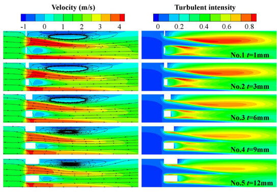Axial velocity contour and turbulence intensity contour for different thicknesses.