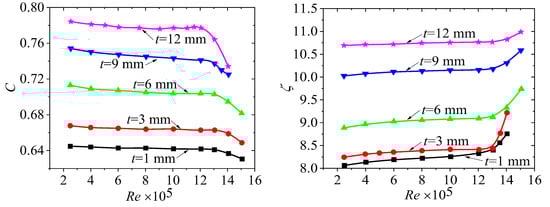 Figure 12 presents the variation of flow coefficient C and pressure drop coefficient ζ with LN2 Reynolds number for different thicknesses. It is found that as thickness t increases, the coefficient C gradually increases, while the ζ gradually decreases. This is because, as can be seen from Figure 10, the increase in thickness leads to a decrease in the maximum velocity of the fluid through the perforated plate, as well as a decrease in the area of vortices downstream of the plate and the turbulence intensity. Therefore, the increase in thickness improves the momentum loss downstream of the plate, leading to improved performance. The inflection points in the curves in the figure are due to the occurrence of cavitation, resulting in a significant decrease in the flow coefficient, which represents the upper limit of flow measurement.