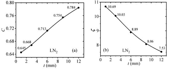 (a) Variation of flow coefficient C and (b) static pressure drop coefficient ζ with different thicknesses.