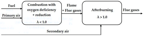 In the event of combustion with air gradation, in the first stage, an oxidant is supplied in an amount that ensures the original ratio of air excess in the following range: λ ≥ 0.6–0.8. Combustion in this phase is sub-stoichiometric, and in such conditions, there is a high concentration of reducing radicals (HCN, CHi, and NHi) that reduce NOx generated in the combustion process. Nevertheless, the drawback of this solution is the danger of forming a considerably high quantity of incomplete or partial combustion products, especially carbon monoxide (CO) and carbon black (defined as PM—particulate matter). In addition, in the event of biomass combustion in the form of wood pellets, there is a significant concentration of carbon (C) in ash and slag deposited in the combustion chamber and a part of the boiler heat exchanger right after the first flue gas return. This problem is often solved by the second combustion stage, in which carbon monoxide, carbon black, and carbon are afterburned by secondary air fed to the afterburning zone in an amount guaranteeing the combustion process for this zone, which is defined by an excess air ratio of λ ≥ 1.0. An idea of the air gradation process is presented in Figure 1.