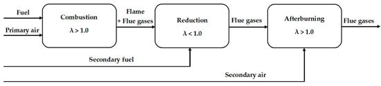 In the event of combustion with fuel and air gradation in the first stage, regular combustion is performed, with the air excess (λ) corresponding to the type of fuel that is combusted. In this stage, a normal quantity of nitrogen oxide (NOx) is emitted. In the subsequent stage, additional fuel is fed to create a reduction zone with the following air excess ratio: λ ≥ 0.6–0.8. Such conditions enable the generation of reductive compounds and radicals that convert NO to N2, reducing the concentration of NOx in flue gases. In the final stage, additional air is fed to obtain the following total ratio of air excess: λ ≥ 1.0, which is to afterburn CO, carbon black, and carbon, which together with ash and slag, is taken to the ash pit and the exchange part of the boiler. An idea of the fuel and air gradation process is presented in Figure 2.