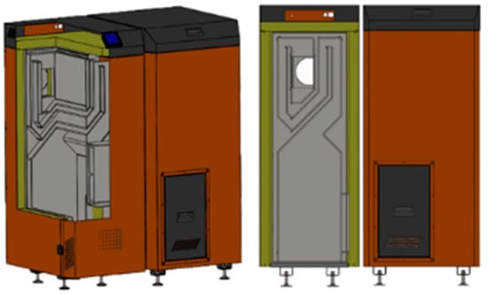 The test object was a biomass boiler (BIOVERT 21, with automatic fuel feed) with a nominal power of 21 kW manufactured by Walendowscy, Pleszew, Poland (Figure 3). The boiler was fuelled with biomass pellets with a minimum grain diameter of 5 mm and an average length of 15 mm (ranging from 5 mm to 25 mm), operating at an output of approximately 25.0 kW. The boiler met the requirements of class five according to EN 303-5:2012 [20]. The operation of the boiler was controlled by a microprocessor controller. For operation at nominal power (25 kW), the recorded fuel consumption was about 3.03 kg·h−1, and the intake air demand was about 22.55 m3·h−1. Figure 2 shows the test facility [21].
