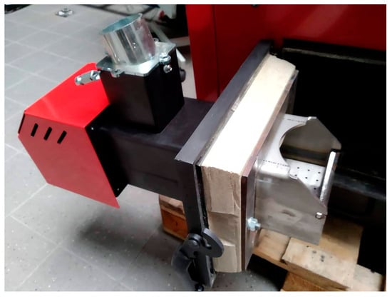 The tests were carried out with the use of a pellet burner (ECOMAT 25 model) designed for the combustion of wood biomass pellets, which was made by Termotechnika, Góra Puławska, Poland (Figure 4). The declared range of the burner power is 5.6–25.0 kW, the declared thermal efficiency is 98%, the average electric power consumption is 40 W/h, and the feeder maximum efficiency is 8.5 kg/h (allows to obtain approx. 38 kW of thermal power). The burner structure is patent protected (PL 222330) within the carbon black afterburning system and the use of the flue gas catalyst. In addition, the burner is equipped with an inertial return flap, which prevents flame from going back to the pellet chute shaft from the feeder, an electronic furnace control by means of a photocell, burner power modulation in the range of 10–100% of the rated power, multi-point supply of primary and secondary air in the burner combustion chamber, and automatic ash removal from the furnace owing to the movable grate activated cyclically by means of an external actuator [22]. The gradation of combustion air is carried out by the distribution of combustion air divided into a primary combustion zone and a post-combustion zone located away from it and the burning fuel bed, which is realised by secondary air ducts. In the standard configuration, the burner for the combustion process uses only the primary zone of air supply located in front of the burnt fuel bed. For this configuration, the burner operates in the following range of excess air ratio: λ = 1.00–2.40. For the purpose of this research, an additional part was installed behind the zone of the burnt bed, which is responsible for supplying secondary air to the zone outside the bed of burnt fuel, but in the zone of functioning in the burner flame and hot combustion gases. For the configuration with an additional secondary air supply zone, the burner operation was also within the range of the following excess air ratio: λ = 1.00–2.40. Therefore, the combustion air staging system for the design of a low-power pellet burner (less than 50 kW) in the configuration submitted for testing is associated with the following two zones of combustion air supply: the primary zone (in the classic configuration mainly responsible for supplying combustion air) and the secondary zone (responsible for supplying air for post-combustion of residues generated by the primary zone). These configurations make it possible to verify whether a disadvantage associated only with the gradation of post-air for the biomass pellet combustion process will adversely affect the post-emergence of harmful substances associated with incomplete combustion.