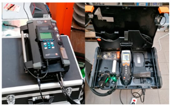 The second instrument used in the tests was a Testo 380 particle analyser (Testo SE & Co. kGaA, Titisee-Neustadt, Germany) coupled with a Testo 330-2 LL exhaust gas analyser (Testo SE & Co. kGaA, Titisee-Neustadt, Germany). The Testo 380 was used to measure particulate matter in the range 0–300 mg/m3 and carbon monoxide (CO) concentration (0–8000 ppm), with a measurement error of ±10 ppm for the measurement point (0–200 ppm) and ±20 ppm for the measurement point (201–2000 ppm), as well as nitrogen oxide (NOx) concentration (0–3000 ppm), with a measurement error of ±5 mg/m3 (0–100 ppm) [28]. Figure 5 presents the aforementioned measurement devices.