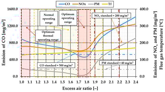 The test results obtained for the second stage are presented in Figure 9, which depicts the change in the CO, NOx, and PM emission and flue gas temperature (Tf) with reference to the excess air ratio (λ).