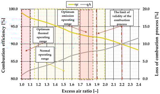 - Operation beyond the range of the significant drop of the combustion process efficiency at the simultaneous significant increase in the loss of combustion.