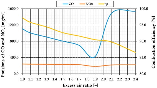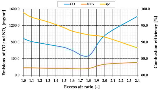 Figure 10 presents the course of the combustion process efficiency (ηc) and related loss of combustion (qA) in relation to the excess air ratio. Figure 11 presents the course of emission of CO and NOx and related combustion process efficiency (ηc) in relation to the excess air ratio for the second stage of research.
