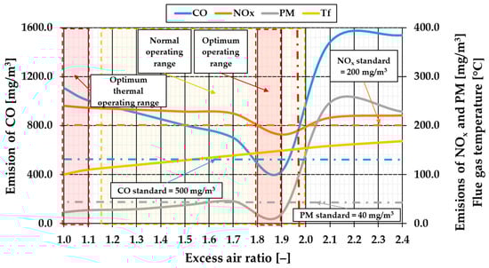 The test results obtained for the first stage are presented in Figure 6, which depicts the change in the CO, NOx, and PM emission and flue gas temperature (Tf) with reference to the excess air ratio (λ). According to the manufacturer’s specification, the burner in its regular operation (with rated power) needs 100 m3/h air maximally for the combustion process, which provides the maximum excess air ratio for such operation parameters of λ = 2.42.