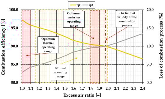 When analysing the course of the combustion process efficiency and the related loss of combustion in relation to the excess air ratio, the following regularities were observed:
