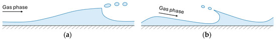 The external forces, namely the dynamic pressure force due to the velocity fluctuations and the shear stress from the velocity difference between the gas–liquid phases, are considered the main forces contributing to droplet destabilization and breakup mechanisms. External shear stress is suggested to be an initial disruptive force because of the high velocity difference between the gas and liquid phases, which also causes pressure variations in the gas–liquid droplet interface [14,40].