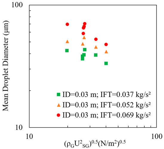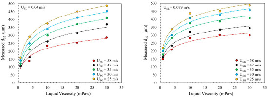 Several authors have observed a significant effect of the liquid viscosity on the droplet size [11,45,46,47,48]. Fore and Dukler (1995) used air–water and air–water/glycerin in their experimental study and observed larger droplet sizes with an increase in liquid viscosity from 1 to 6 mPa·s [11]. It is suspected that an increase in liquid viscosity resists the external disruptive forces applied by the high-velocity gas phase, enhancing droplet stability and resulting in larger droplet sizes.