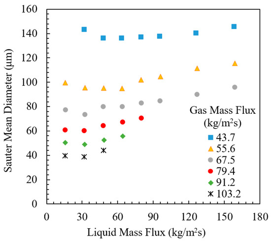 The effect of superficial liquid velocity on droplet size is more complex and may depend on droplet formation mechanisms [6,10,50,56]. Figure 5 shows the variation in d32 with liquid mass flux, which was reproduced based on the data from [6]. The droplet size decreases with an increasing liquid mass flux at low gas and liquid flow rates, and then it increases after passing a minimum. Similar trends were also observed by several other researchers, such as [10,50,56]. Teixeira (1988) [10] noticed that the greater the gas flow rate, the lower the liquid flow rate at which the minimum occurred.