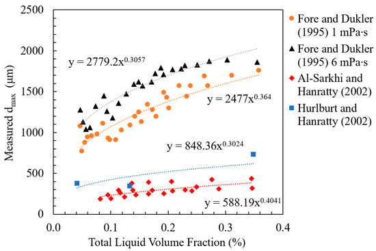The open source experimental data indicate the dependence of the maximum stable droplet size on the total liquid volume fraction to a power of approximately 1/3, as demonstrated in Figure 7.