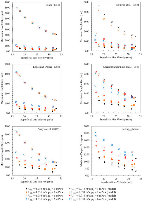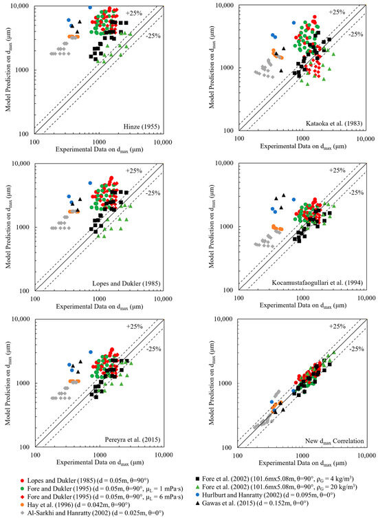 Comparison of predictive model ([14,40,41,46,78] and the new model) results against experimental data of dmax in gas–liquid annular flow from [11,40,48,55,58,61,64].
