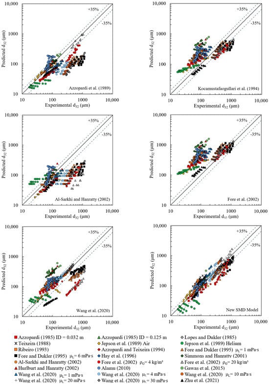 Comparison of predictive models against experimental data for SMD for gas–liquid annular flow. Previous models are from [6,13,40,46,47,59,62,66,81,82,83]. The experimental data are from [6,10,11,40,44,48,49,50,55,56,58,59,61,64,65,66].
