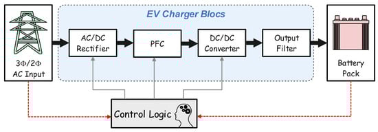 Critical loads like those associated with the military, hospitals, and data centers are constantly present in the system. The government might lose a significant amount of money if these loads fail. Therefore, the V2G mode of operation of EVs is sensitively employed to provide active and reactive power support to essential loads in order to assure the uninterrupted supply to these loads. This EV operation mode, known as the V2L mode of operation, is covered in depth in [18,19,20]. The V2L mode of operation for EV chargers may be viewed as a special case of the V2H and V2V modes. The offboard charging infrastructure, as shown in Figure 2, is located independently and can handle fast charging up to hundreds of kilowatts (kW); onboard charging stations are installed on the electric vehicle (EV) itself and are utilized for lesser power levels [21]. The harmonics have been eliminated, and the reactive power has been regulated using an LC filter [9]. The charging stations we have in our houses can be used for level 1 charging, which uses modest power. Integrating local power generation, such as renewable energy sources (RESs), into the EV charging infrastructure is one effective way to mitigate the damage [22,23,24,25,26]. Both public and private apps use level 2 charging, which charges the battery pack more quickly than level 1 charging. The quickest and most popular charging method is level 3 charging. There are available unidirectional and bidirectional charging techniques. They could either have two stages or only one [8]. In a two-stage EV charger, two converters, AC to DC (first stage) and DC to DC (second stage), are connected in a cascade. The galvanic isolation between the grid and the battery pack is provided by the second-stage converter, which reduces the ripple on the battery side [25]. Bidirectional chargers offer the advantage of allowing the car to run, while chargers with unidirectional topologies can only transmit electricity from the utility grid to the vehicle (G2V) grid mode (V2G), where electricity can be transferred between grids via vehicles whenever necessary [26].