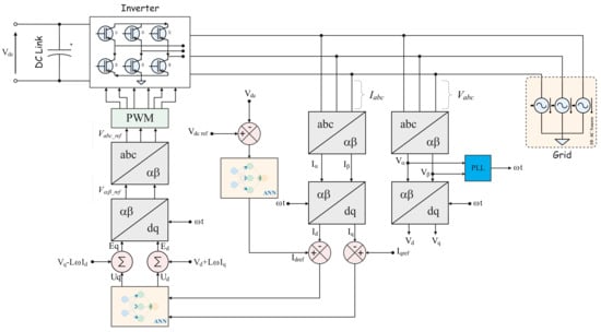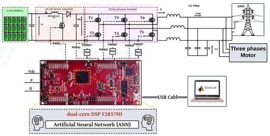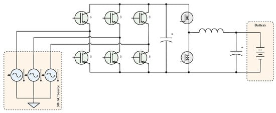 Figure 5 shows the system architecture using AC–DC (first) and DC–DC (second) power. A bipolar transistor with an insulated gate (IGBT) serves as the foundation of both converters. In the AC–DC step, there are six IGBTs employed, but there are only two in the DC–DC stage. Each switch has a voltage blocking limit of . While the second stage is connected to a battery, the first stage is directly connected to the three-phase grid. Figure 6 illustrates the architecture of our controller design, which uses an ANN to manage the system.