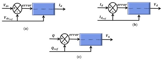 Determining active–reactive power at the AC side of the EV charger in the dq domain is the first difficult task. The ABC domain is transformed into the dq domain via the park transformation. Park generates , , , and as well. Current is determined by comparing the voltage difference between the link and the reference, and a model ANN controller helps to reduce mistakes as shown in Figure 7a. A model ANN controller maintains the reference ref equal to , as provided in Figure 7b. The final model ANN controller is illustrated in Figure 7c; this model maintains the reference of reactive power equal to the reactive power that has been measured, and the output of this model is voltage . We combined , , and decoupling; this coupling is shown in Equations (2) and (3). While Figure 8 illustrates the ANN model for the buck-boost converter.