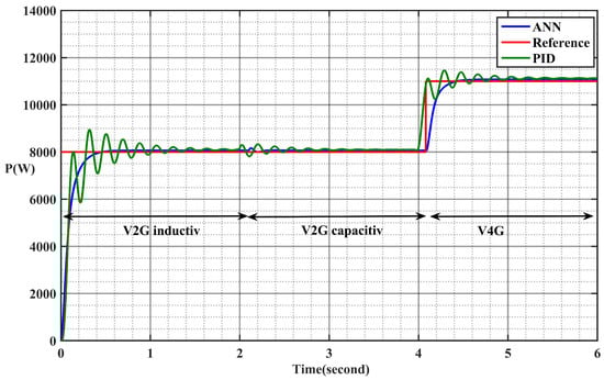 Several articles primarily emphasize the utilization of PID and model predictive controllers as the preferred techniques for managing the active and reactive power in EV chargers. However, this article introduces an alternative approach rooted in artificial intelligence, which proves to be highly effective. The results demonstrate that this AI-based method exhibits minimal overshoot and rapid response times for both active and reactive power, as depicted in Figure 13. In particular, the active power in the V2G and V4G modes remains stable, closely following the reference values set by the ANN algorithm. In contrast, the PID controller exhibits substantial overshoot and extended response times. It is worth noting that the reference values for active power are 8 kW for V2G (both inductive and capacitive) and 11 kW for V4G mode. The simulation of the system was conducted using MATLAB Simulink, employing the parameters outlined in Table 1 for accuracy and precision. The simulation setup is grounded on a grid delivering a stable voltage of 415 volts. Ceramic capacitors were strategically integrated to ensure the stabilization of the voltage link between the buck–boost converter and the inverter–rectifier, facilitating seamless bidirectional power flow. Notably, the control mechanism of the system is predominantly governed by references to both active power and reactive power, ensuring efficient and reliable operation under various conditions.