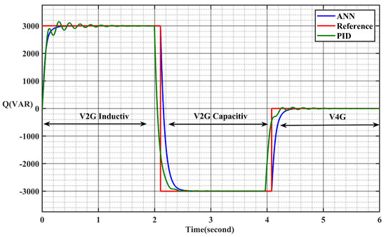 The reactive power for both V2G and V4G modes, comparing the PID and ANN methods.