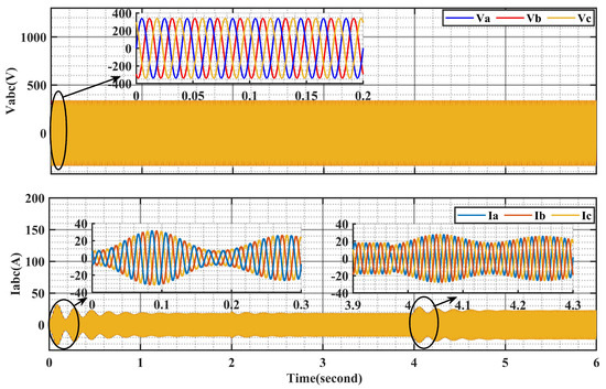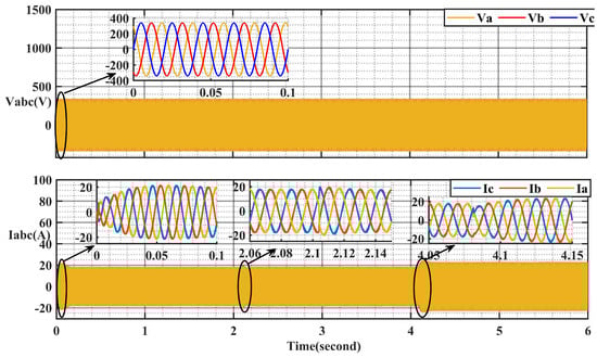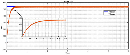 Figure 23 provides a detailed illustration of the system’s performance. It notably shows a consistent DC capacitor link voltage of 540 volts, meticulously maintained to ensure the stability of the DC link capacitor voltage at this uniform level. This sustained voltage is crucial for promoting the system sustainability, optimizing the energy efficiency, and enhancing the overall performance. By converting the DC voltage into a sinusoidal waveform, the inverter enables the seamless integration with the grid, facilitating efficient energy transfer and utilization. The use of sinusoidal waveforms also helps to minimize harmonic distortion and improve the quality of the power supplied to the grid.