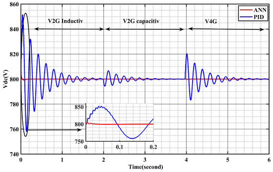 This simulation presented our system in MATLAB Simulink. First, we have a grid, and, next, we used an AC–DC bidirectional inverter that is controlled by an ANN controller. The link is stabilized with the capacitor maintained at a value of 400 V. In the second stage, a DC–DC converter works as a boost, and the boost converter maintains the voltage link at 800 V. In this mode, the system works in V2G for inductive and capacitive discharging, and the reactive power for V2G is negative for discharge capacitive and positive for discharger inductive. The reactive power is null for mode V4G because the vehicle works as a compensator.