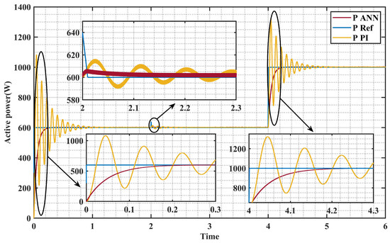 Figure 17 demonstrates the voltage of the link, which serves as a representation of the output voltage generated by the rectifier/converter. Remarkably, this link voltage demonstrates a flawless performance when utilizing the ANN method. It remains devoid of any overshooting tendencies, notably diverging from the PID controller’s behavior, particularly when transitioning between operational modes.