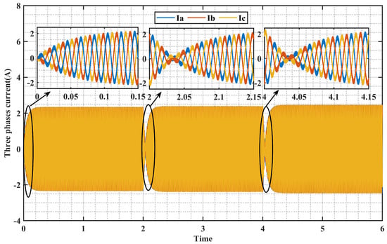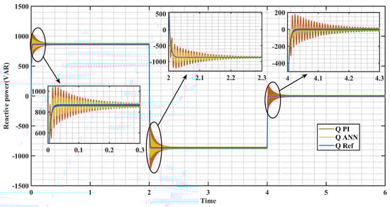 Figure 14 displays remarkable performance in terms of reactive power, featuring swift response times and notably diminished overshooting, in stark contrast to the results obtained with the PID controller. The reference values for reactive power are set at 3 kW for V2G inductive mode and −3 kW for capacitive mode. Notably, in V4G mode, the reactive power becomes null, courtesy of the EV’s battery efficiently compensating for it. This mode showcases exceptional efficiency, obviating the necessity for compensation capacitors.