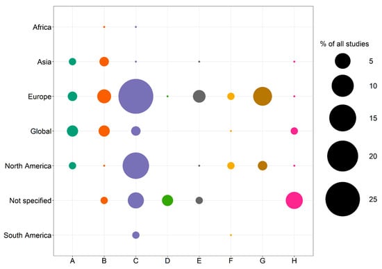 A spatial distribution of the reviewed studies addressing the categories’ impacts on the abiotic environment (A), impacts on the biotic environment (B), impacts on birds and bats (C), noise impacts (D), visual impacts (E), other impacts (F), social acceptance of onshore wind energy (G), and multiple impacts (H). The size of the circles represents the share of studies addressing the critical topic in the geographical regions.
