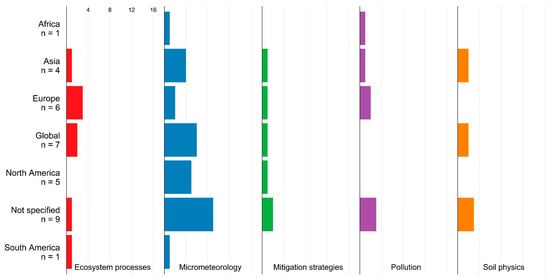 Although micrometeorological impacts are still the most investigated abiotic impacts in all regions except for Europe, the impact is not yet well understood as studies on the impacts of WTs on land–atmosphere exchanges are relatively new, and effects on the local microclimate are highly variable and difficult to predict [146,151]. Most of the studies (89%) addressing micrometeorological impacts in this review did not measure effects but they did summarize results from other studies, analyze remote sensing data, or present modeling results. Detailed explanations of physical processes and spatial variations in wind farm–atmosphere interactions, particularly hydrometeorology, remain largely unknown and debatable due to observational limitations and model deficiencies [132].