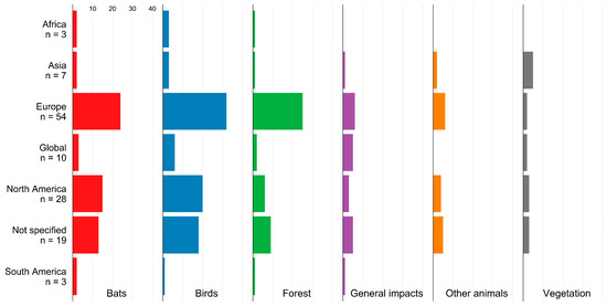 The biotic impacts of WE include impacts on birds and bats, other wildlife, forests, vegetation, and general impacts on biodiversity (Figure 3). Impacts on birds and bats are the most evidenced critical topics in the context of biotic impacts across almost all study regions. In Europe, wind energy impacts on forest ecosystems are also in the focus of research.