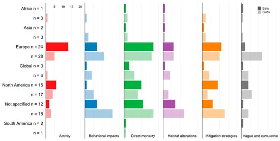 Birds and bats are identified as the main wildlife groups affected by WTs [30,81] and suffer disproportionately from WTs [62]. The impacts include direct mortality related to species’ activity, habitat alterations and loss, behavioral impacts, and vague and cumulative impacts (Figure 4) [16,17,35,62,80,81,95,97,102,127,154]. Most studies focus on direct mortality in Europe, North America, or in general (no area specified) while neglecting other study areas and providing weaker evidence on habitat alterations and behavioral impacts.